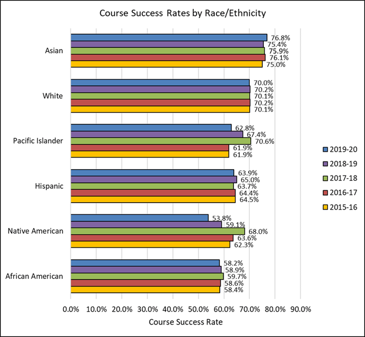 Figure 1. The RCC course success rates disaggregated by race/ethnicity from the 2015-16 to 2019-20 academic years. Grades of EW are counted as unsuccessful in Spring 2020.